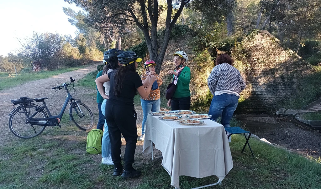 6 personnes s'accordant une pause au bord d'un sentier après une excursion en vélo
